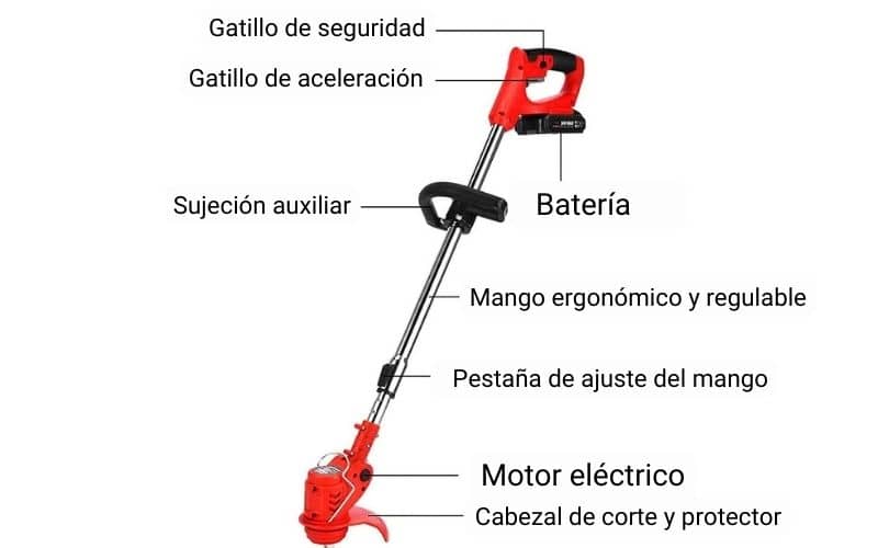 La desbrozadora consta de varias partes: un motor, una barra guía y una cuchilla de corte. Dependiendo del modelo y tipo de desbrozadora, también puede tener accesorios como cabezales de hilo de nylon para cortar hierba más baja o cuchillas metálicas para cortar arbustos y ramas más gruesas.